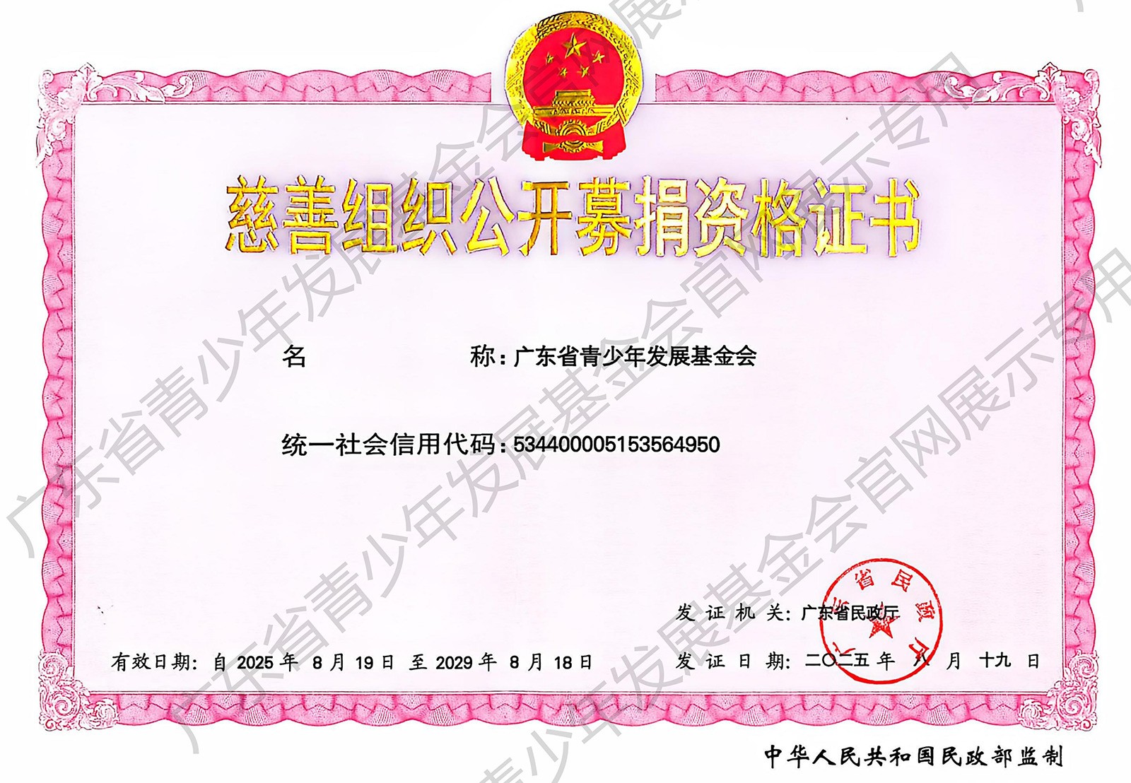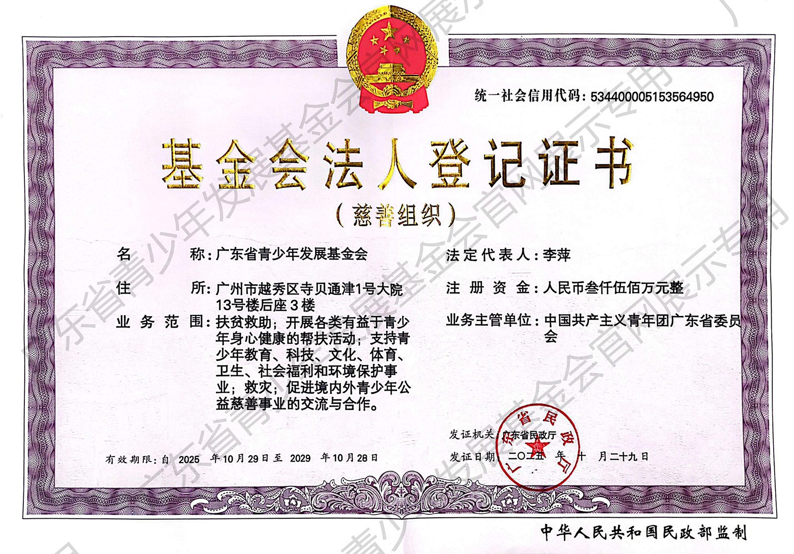 广东省青少年发展基金会简称为“广东青基会”,成立于1994年4月,是共青团广东省委员会、广东省青年联合会、广东省学生联合会、少先队广东省工作委员会共同创办,具有独立法人资格的5A级公募基金会。广东青基会积极践行“为党育人、为国育才,汇聚爱心、传递温暖,为青少年成长提供新助力、播种新希望”的组织使命。