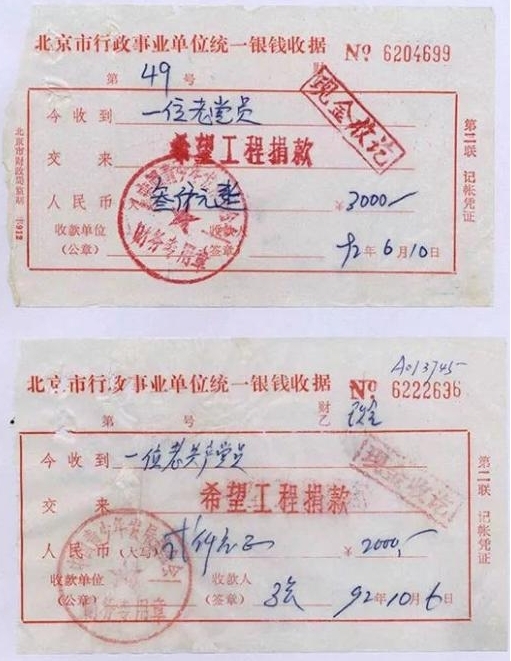 邓小平同志为希望工程捐款的收据。中国青少年发展基金会供图