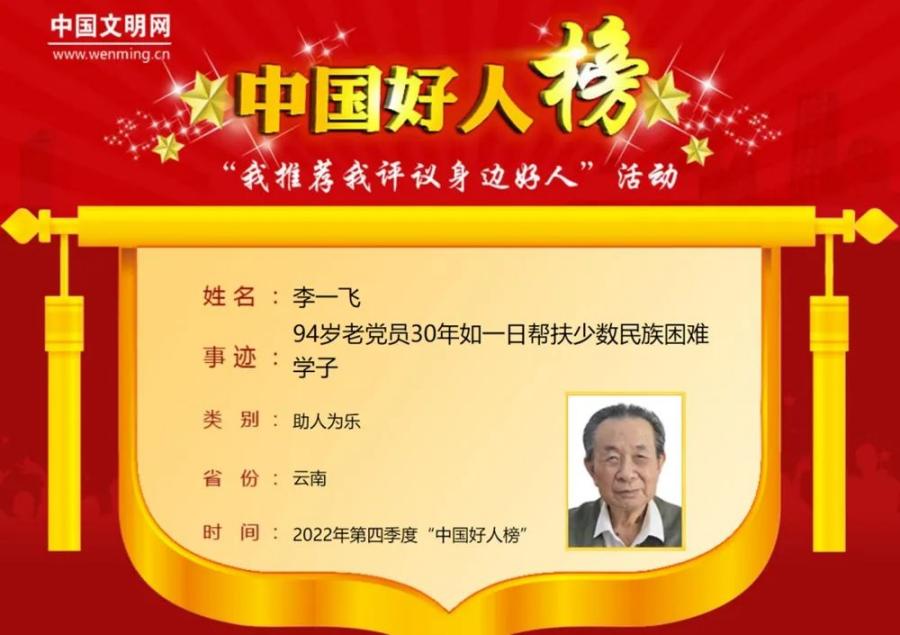 1992年,刚退休的李一飞偶然看到了报纸上关于山区孩子因家庭贫困上学困难的报道并了解到中国青基会的希望工程项目,决定将200元捐赠给云南山区的孩子,那时他一个月的退休工资还不足200元。