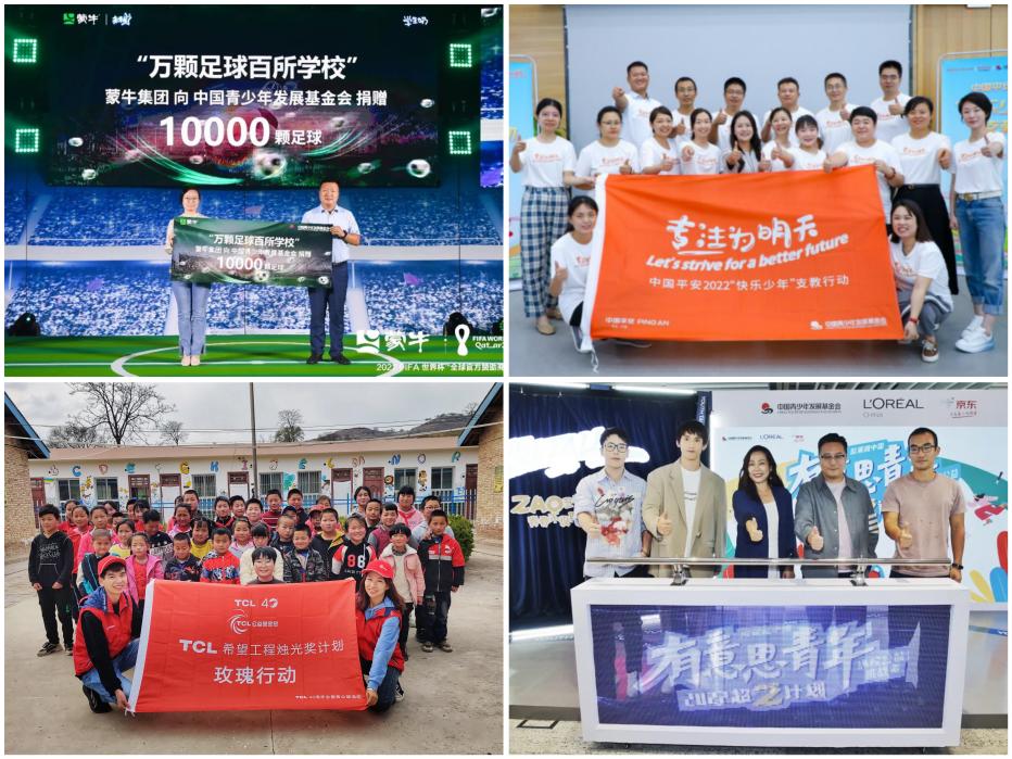 自2008年,广发银行就与中国青少年发展基金会携手开展公益合作,以“点燃希望,照亮人生”为宗旨,致力于改善青少年教育问题及成长环境;2010年梅赛德斯-奔驰携手中国青基会共同设立“梅赛德斯-奔驰星愿基金”,是目前奔驰在全球范围内启动资金最多的综合性公益事业基金,截至2022年底梅赛德斯-奔驰累计向星愿基金注资超过3.2亿元;2021年,幻方量化与中国青基会开启公益合作,开展实施“希望工程1+1·幻方助学计划”,目前项目已累计捐款3亿元,在全国22个省份的832个县资助29.1万名小学在校女生,为她们提供学习生活补助,帮助其更好地完成学业、健康快乐地成长。