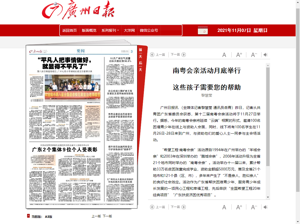 11月6日,广州日报·新花城记者从共青团广东省委员会获悉,第十二届南粤会亲活动将于11月27日举行。据悉,今年的南粤会亲将延续“云端”相聚的形式,邀请100名困境青少年在线上与资助人会面,同时,线下将有100名学生在11月26日到28日来到广州,与资助他们的爱心人士一同参与主会场活动。“希望工程·南粤会亲”活动源自1994年在广州举办的“羊城会亲”和2003年在深圳举办的“鹏城会亲”,2008年活动升级为全省21个地市同时举办的“南粤会亲”。活动举办十一届以来,累计帮助33万名贫困孩童完成学业,资助金额超5000万元,惠及全省21个地市和121个县(区、市),多年来产生了“不是亲人,胜似亲人”的良好社会效应。活动作为广东省帮扶困难青少年、服务青少年成长发展的一项民心工程和幸福工程,先后荣获“全国希望工程 20 年经典项目”“广东扶贫济困优秀项目”。