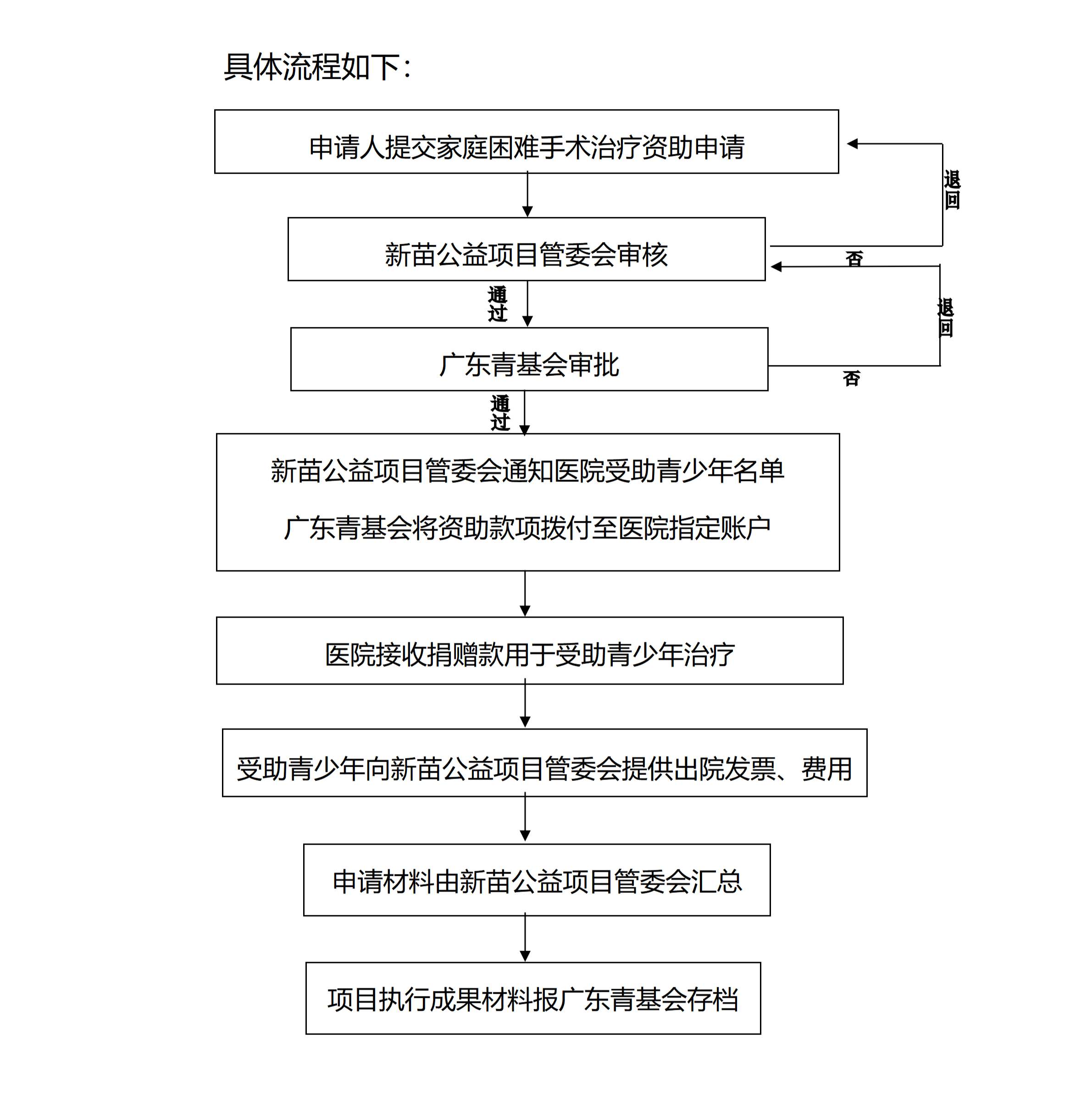 备注:基金申请审核及资助备案等若涉及双方各自内部流程部分,由各自运行完成。如广东青基会财务审批流程由广东青基会自行处理,中山大学附属第三医院配合;中山大学附属第三医院的捐助款项管理及备案流程,由医院自行按照相关规定通知其财务、设备、医务、宣传等相关部门,广东青基会配合。